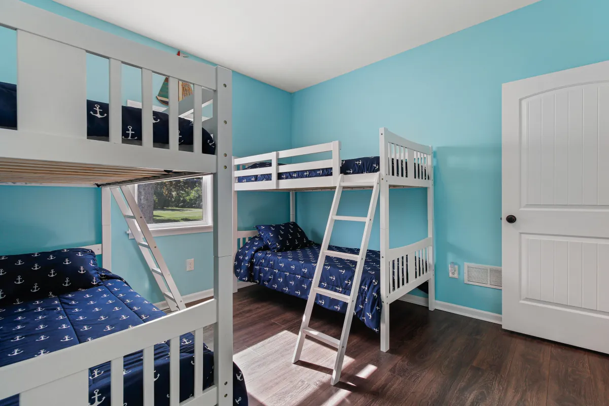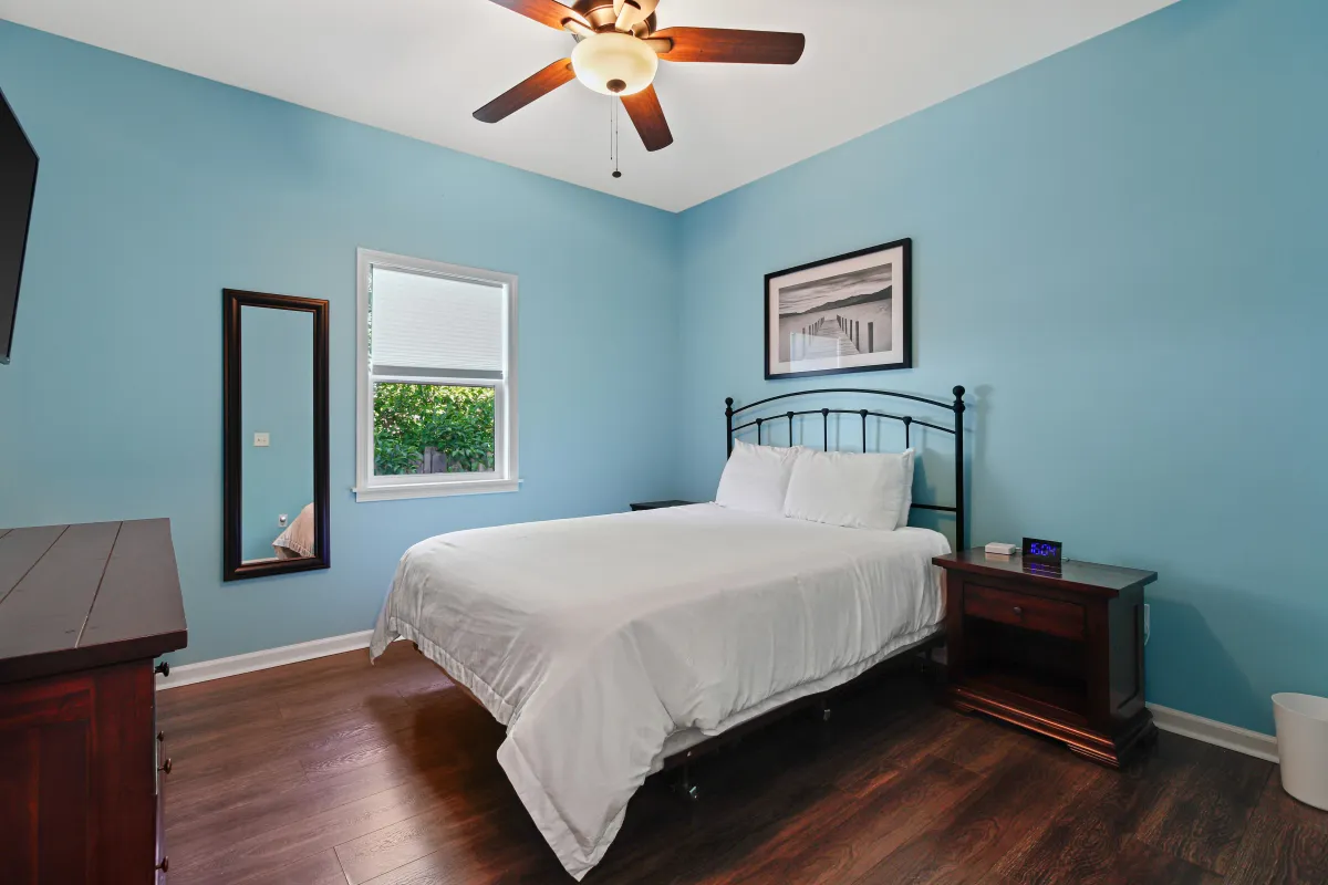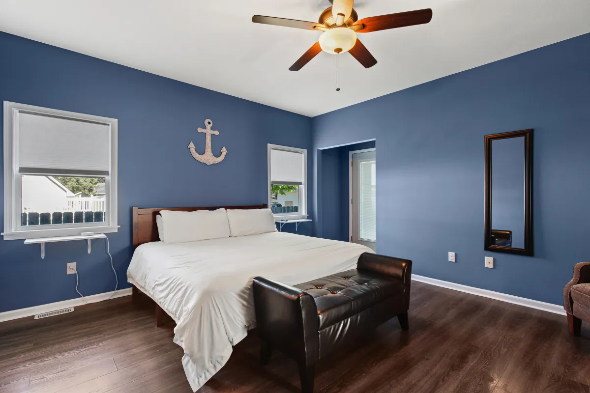 Treat yourself to the Nautically themed master suite which features a King bed with a cushioned leather chase, TV, ceiling fan and access to private deck.