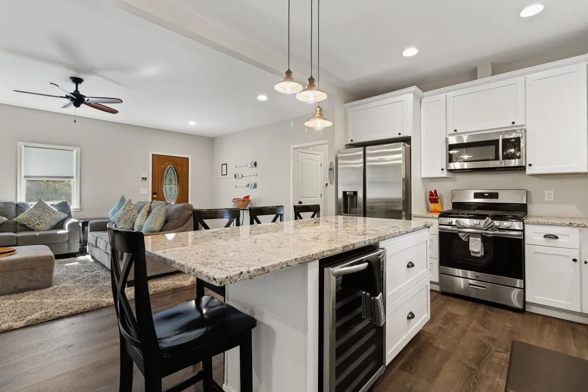Our kitchen features a full size range with oven, microwave, full size refrigerator, wine fridge, farm house sink and a dishwasher. The kitchen is equipped with a coffee maker and complimentary coffee.