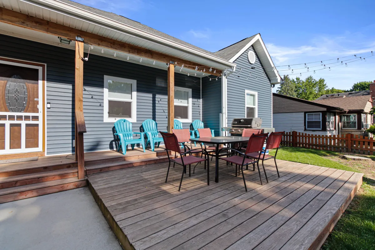 Enjoy entertainment outside on our front deck. The deck has chairs, a table, and a propane grill.
