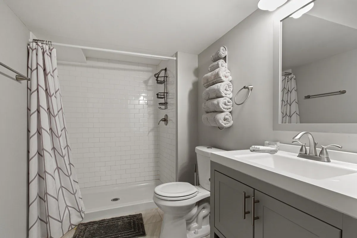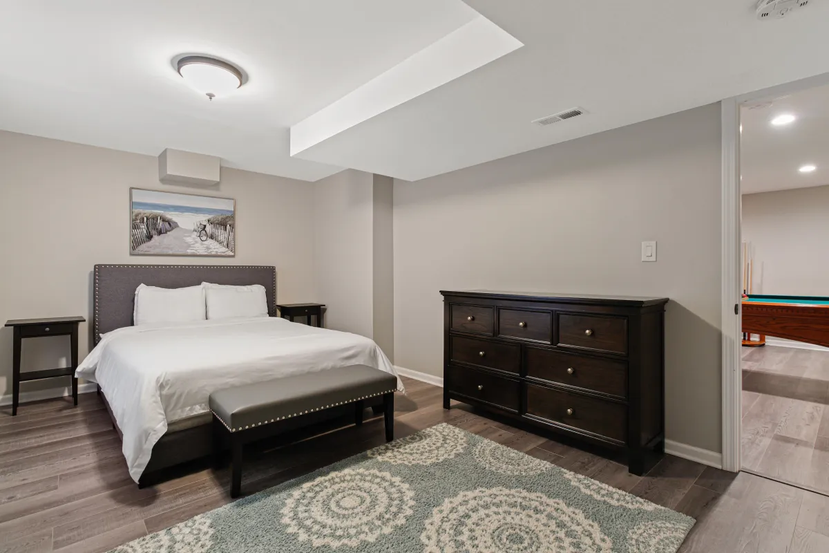 Our master bathroom features a double vanity, shower and jet bathtub. There is a walk in closet for extra storage during your stay.