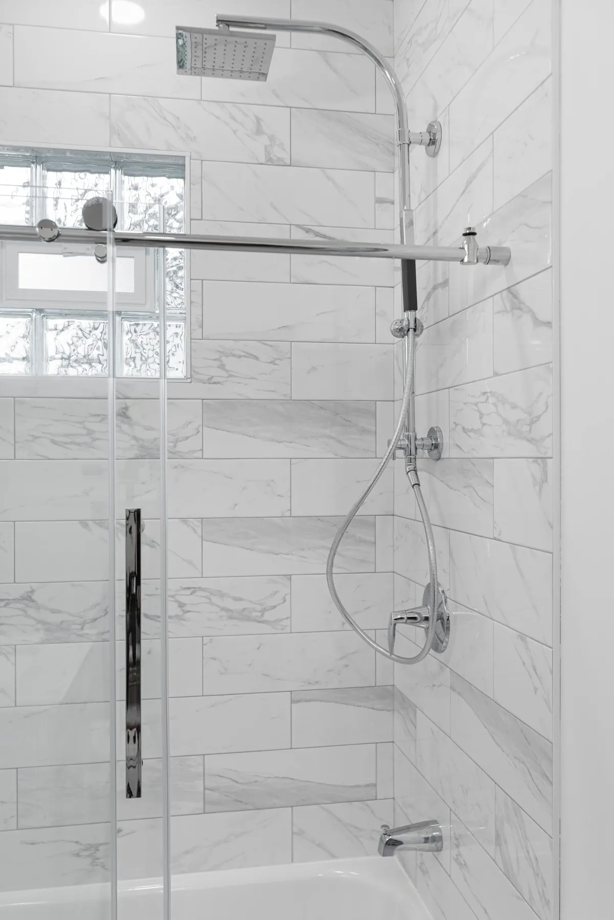 Featuring marble tile and a Kohler Rain spa fixture for an amazing shower experience