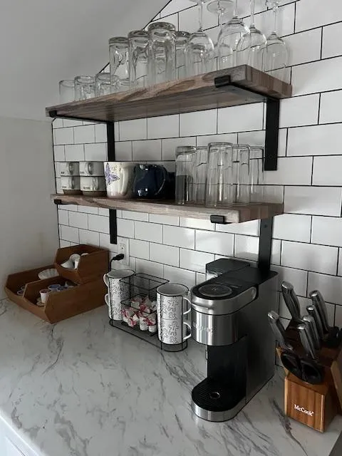 Full coffee and tea bar featuring a Ratio 6 drip coffee machine. Keurig K cup and Hamilton drip coffee machine also provided.