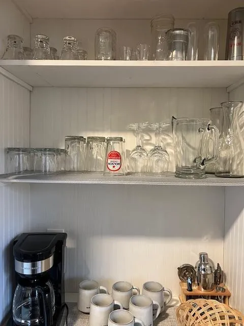 The kitchen has a full cooking and dining ware set including glasses, plates, mugs and utensils. Disposable cups and plates also provided.