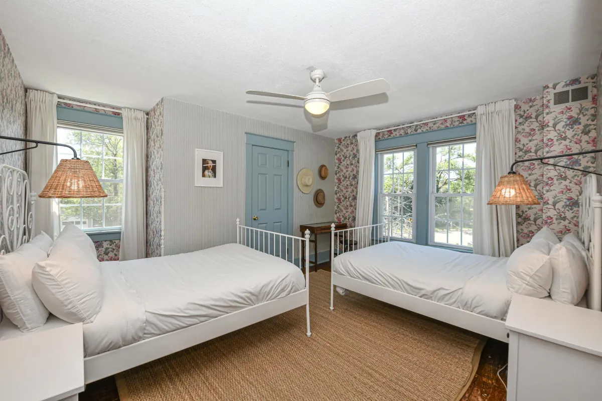 This large room overlooking the back yard features two full beds.