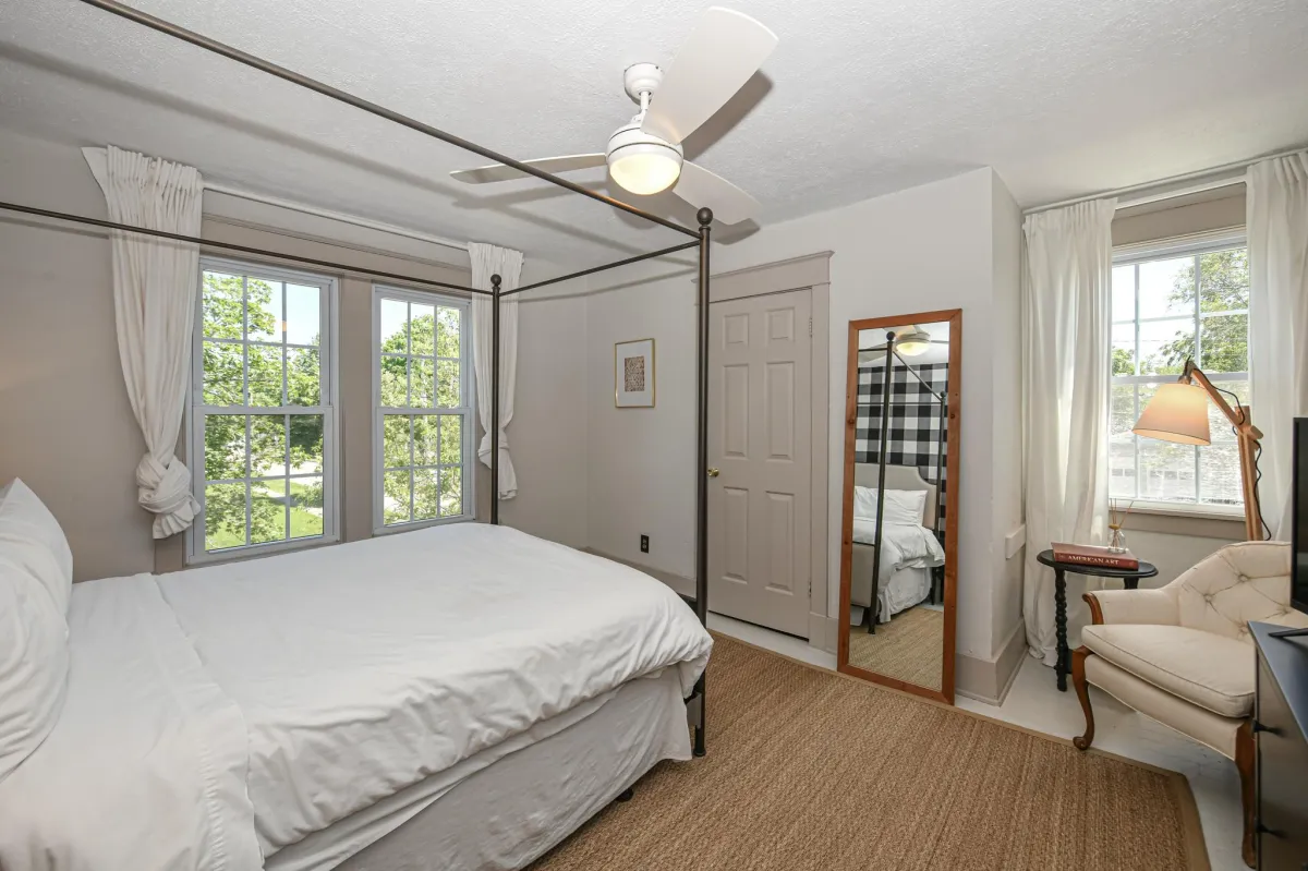 Spacious master bedroom with queen mattress on a four post bed.